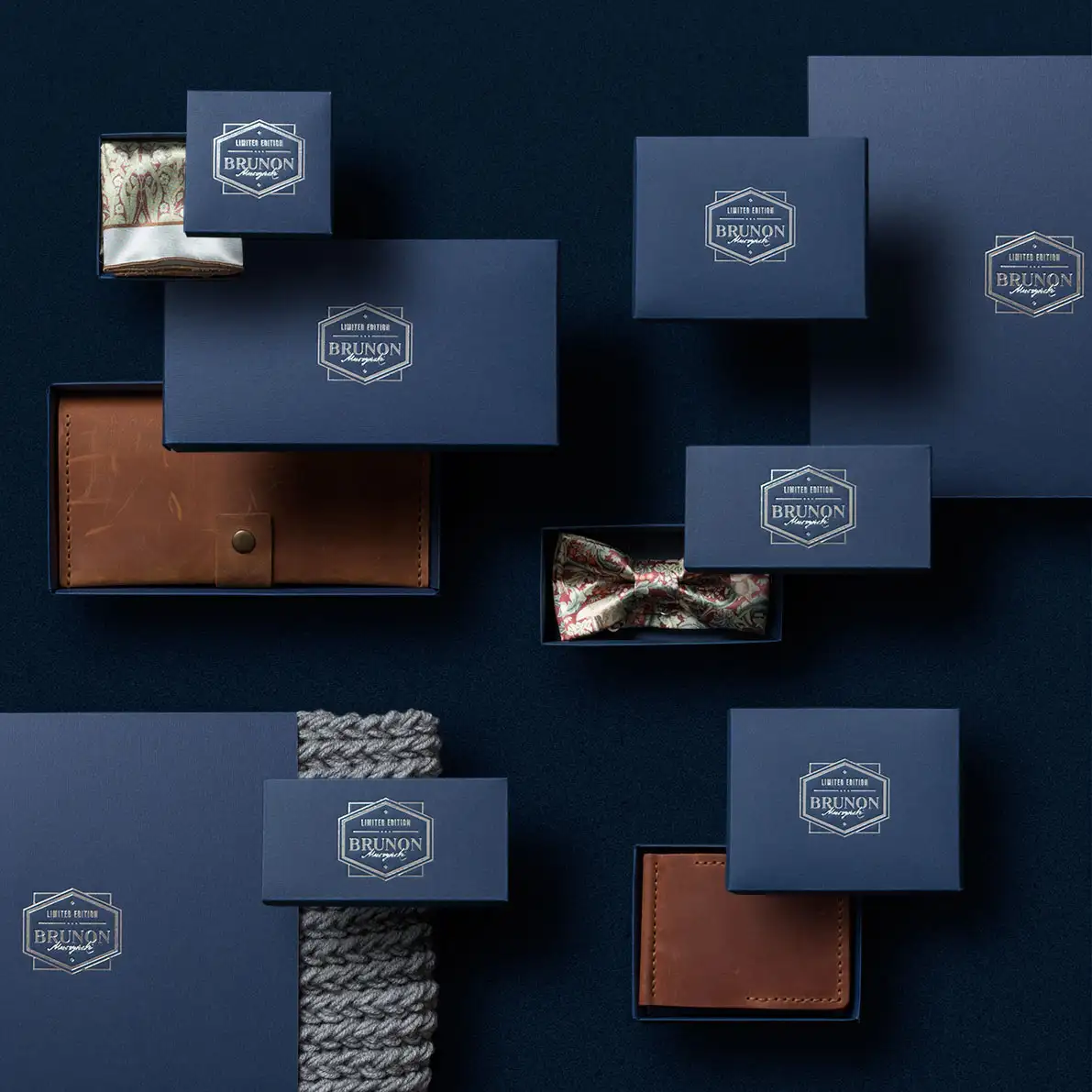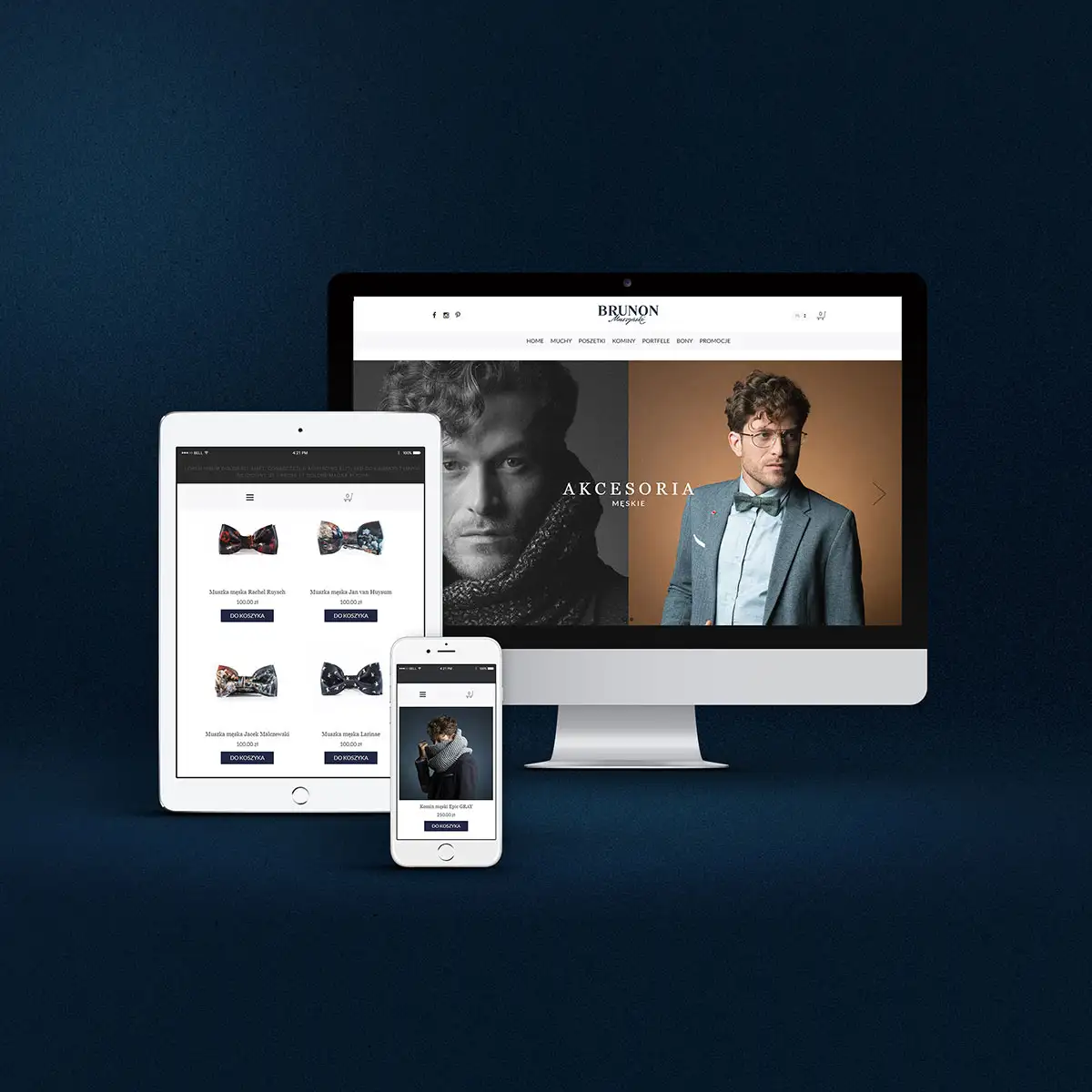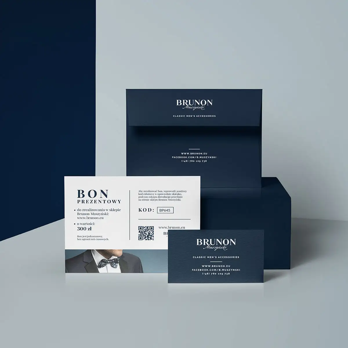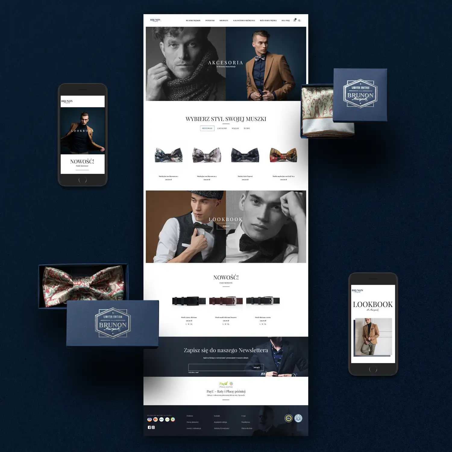 Projekty dla marki odzieżowej Brunon Muszyński. Zakres prac: branding, logotyp, identyfikacja wizualna, projekt i wdrożenie sklepu internetowego, zdjęcia produktów, projekt opakowań, materiały POS.